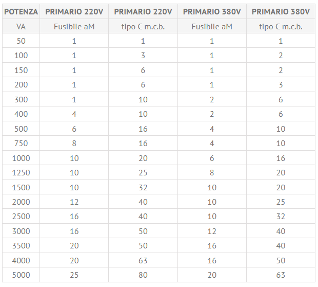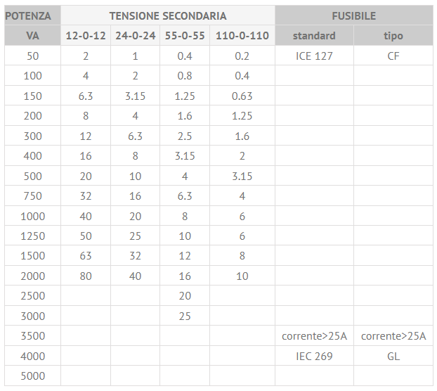 In conseguenza, la tabella seguente riporta i valori dei fusibili da collegare sul circuito secondario (all’uscita) consigliati per la protezione dei trasformatori di maggiore diffusione: