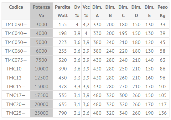Dv: caduta di tensione da vuoto a pieno carico – Vcc: Tensione di corto circuito.
